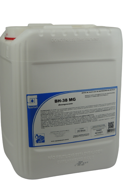 BH-38 MG 20 Litros: Desengraxante Industrial Biodegradável Spartan Produto químico da linha de desengraxantes para limpeza. BH-38 MG 20 Litros é indicado para remoção de sujeiras difíceis, tais como, graxa, óleo e gordura. Utilizado em motores, rolamentos, engrenagens e peças em geral. BH-38 MG 20 Litros pode ser diluído em água na proporção de até uma parte do produto para cinquenta partes de água.