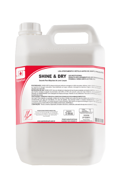 Shine & Dry 5 Litros – Secante Para Máquinas de Lavar Louças Spartan, é um produto químico da linha de cozinhas industriais para melhorar a secagem e o brilho nos pratos, talheres, copos, xícaras e bandejas. Shine & Dry seca totalmente as louças evitando a formação de manchas d’água. Shine & Dry é um produto químico utilizado em processo mecanizado em cozinhas industriais e permite diluição em água na proporção de 1 ml do produto para cada litro de água. Mas verificar a capacidade do tanque da máquina. Shine & Dry 5 Litros – Secante Para Máquinas de Lavar Louças Spartan