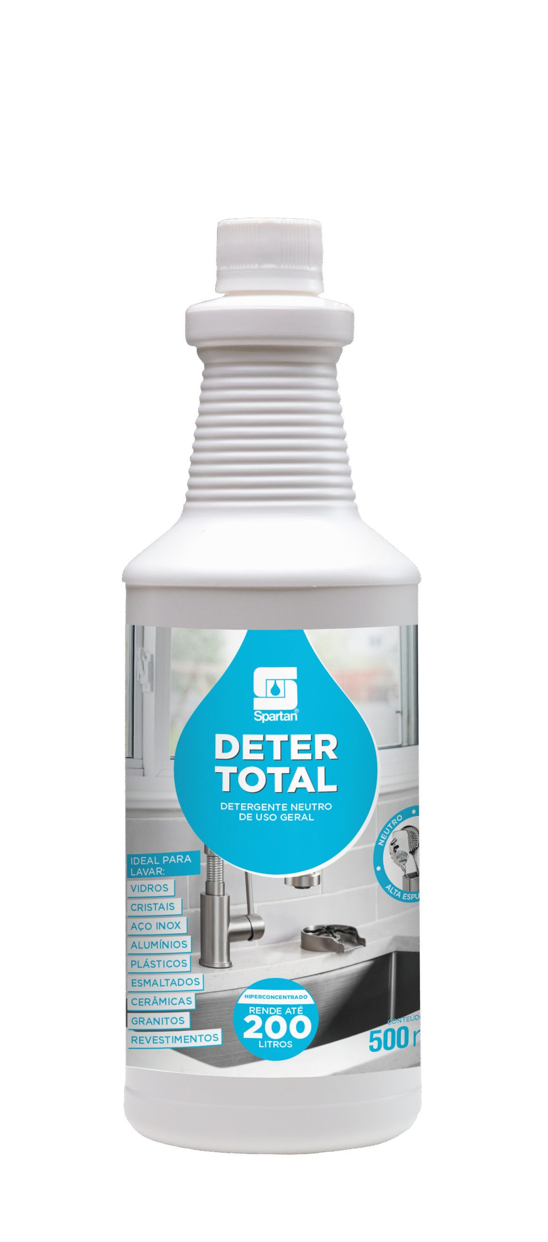Spartan deter Total – Detergente neutro hiperconcentrado de alto rendimento. Remove eficientemente gorduras, oleosidades e fuligens em vidros, cristais, utensílios de aço inox, alumínios, plásticos, esmaltados, cerâmicas, granitos e revestimentos em geral. SPARTAN DETER TOTAL – Eficiência na Limpeza com Alto Rendimento. Conheça toda a Linha Prática Spartan e se apaixone!!!