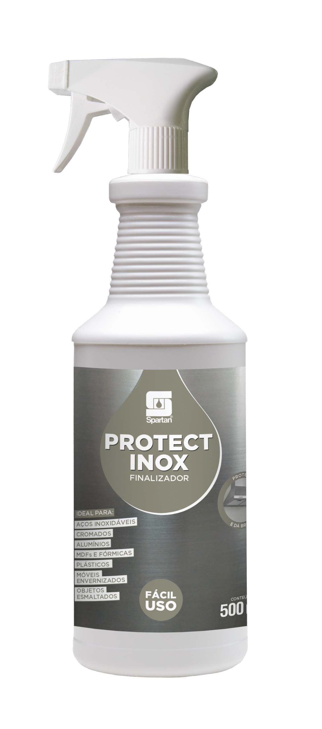 Spartan Protect Inox. Finalizador destinado para a proteção e brilho de superfícies. Forma uma película protetora e não oleosa, que facilita a limpeza, protegendo superfícies contra oxidações e minimizando manchas em geral. Ideal para aço inoxidável, cromados, alumínios, fórmicas, MDF, plásticos, móveis envernizados, objetos esmaltados em geladeiras, fogões, freezers, coifas, lixeiras, metais sanitários, elevadores, corrimões e mobílias em geral.